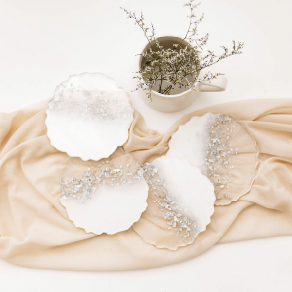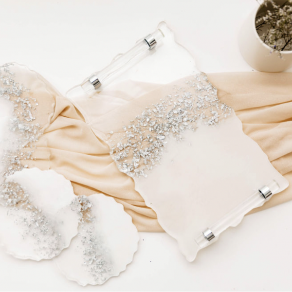 Our Elite tray and coaster collection features an elegant combination of pearl white and silver accents while keeping the other half transparent for a more classy and unique style.