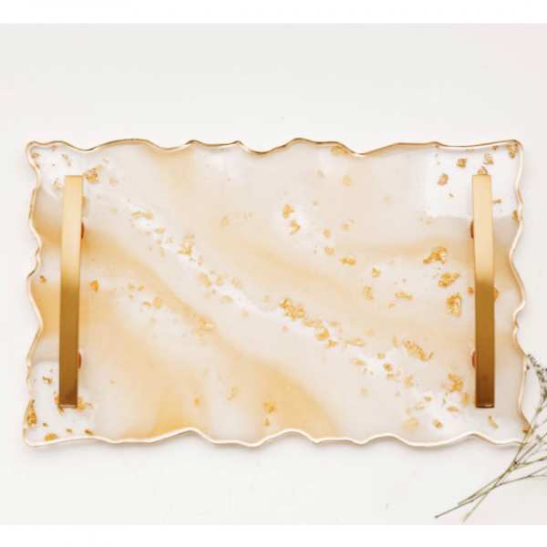 A stunning tray and coaster set, exquisitely crafted, that complements cocktails, sweets, or as a convenient spot to rest your drink while on the move. The blend of gold and white tones exudes both elegance and practicality, while the stylish pattern injects a playful element that emanates a gentle, twinkling radiance.
